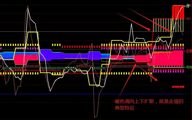 线条色块看似很多,但是只要看色调就好,暖色调产生并逐步扩大,就是多方行情,如果红色占满0-100之间,基本就可以判断是妖股啦。